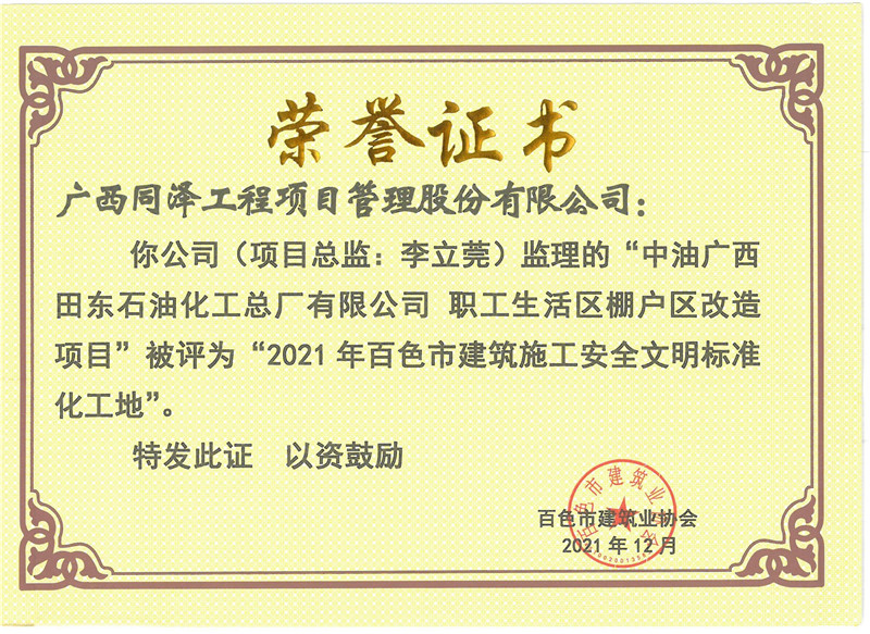 中油廣西田東石油化工總廠有限公司職工生活區(qū)棚戶區(qū)改造項(xiàng)目榮獲2021年度安全文明標(biāo)準(zhǔn)化工地