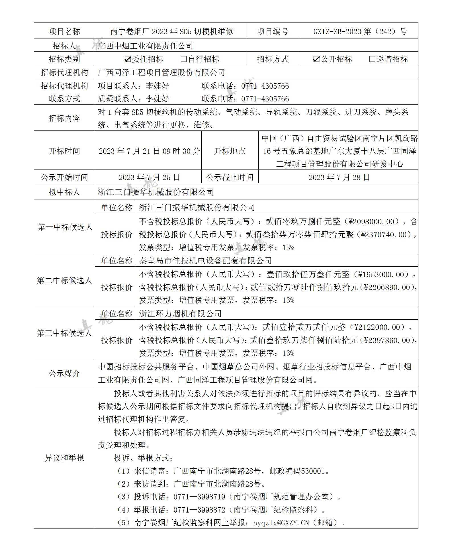 廣西中煙工業(yè)有限責(zé)任公司南寧卷煙廠(chǎng)2023年SD5切梗機(jī)維修(項(xiàng)目編號(hào):GXTZ-ZB-2023第(242)號(hào))中標(biāo)候選人公示