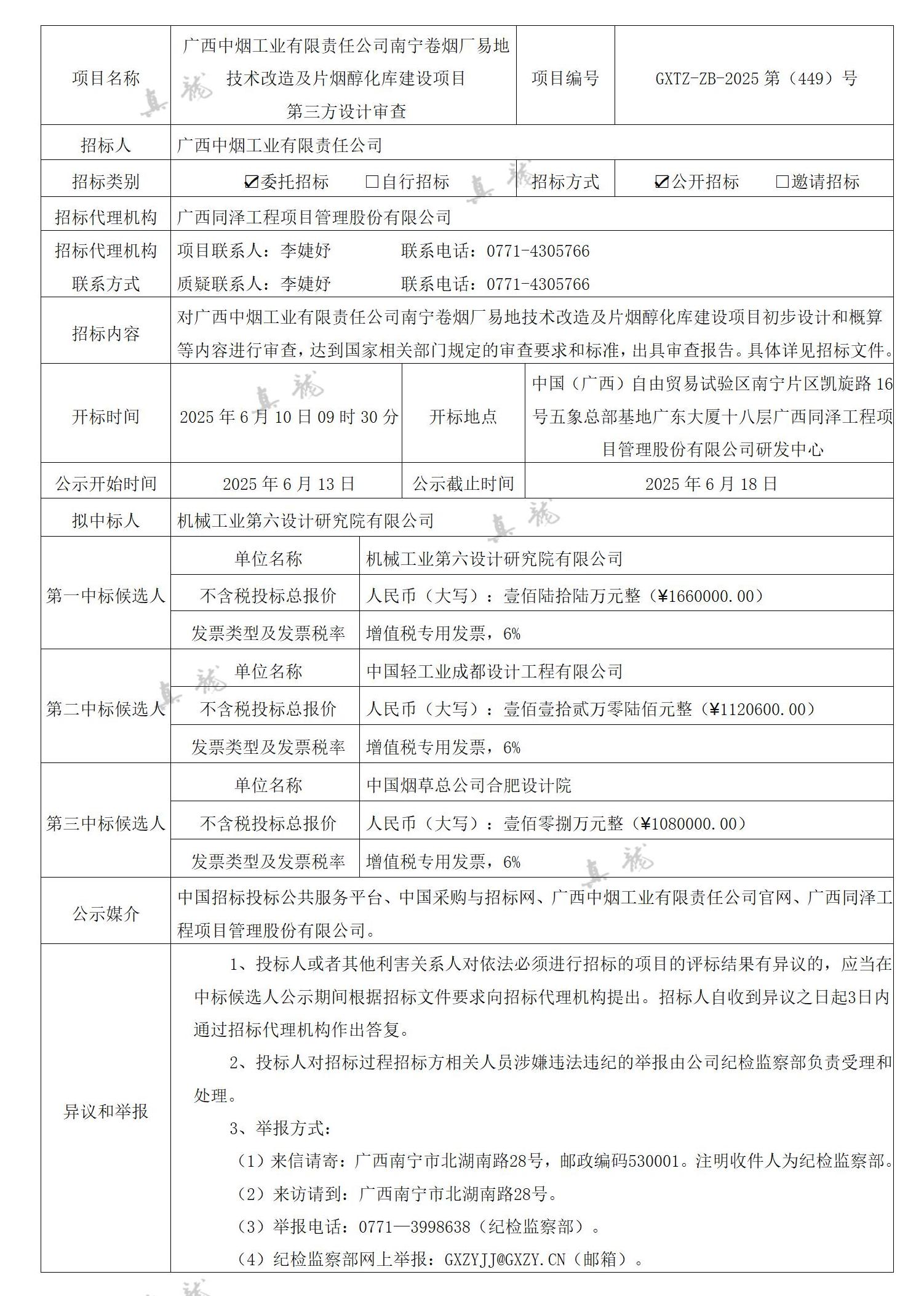 廣西中煙工業(yè)有限責任公司南寧卷煙廠易地技術改造及片煙醇化庫建設項目第三方設計審查(項目編號:GXTZ-ZB-2025第(449)號)中標候選人公示