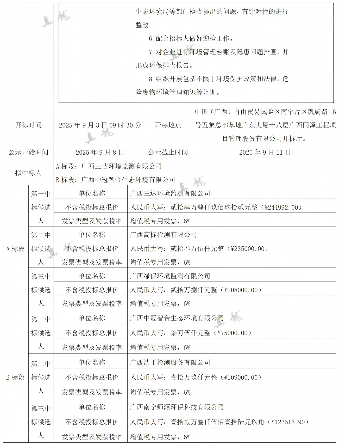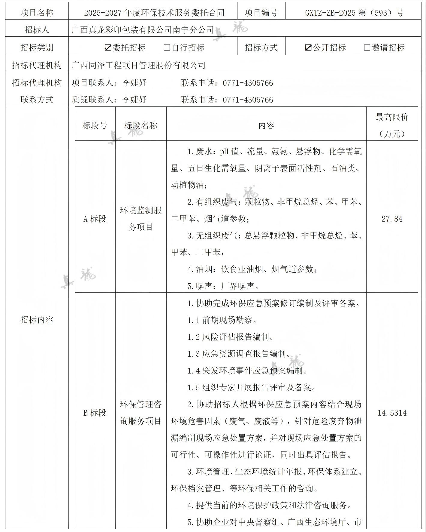 廣西真龍彩印包裝有限公司南寧分公司2025-2027年度環(huán)保技術(shù)服務(wù)委托合同(項(xiàng)目編號(hào):GXTZ-ZB-2025第(593)號(hào))中標(biāo)候選人公示